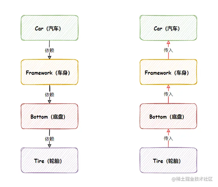控制反转式程序开发中的对象创建顺序是:Tire -> Bottom -> Framework -> Car