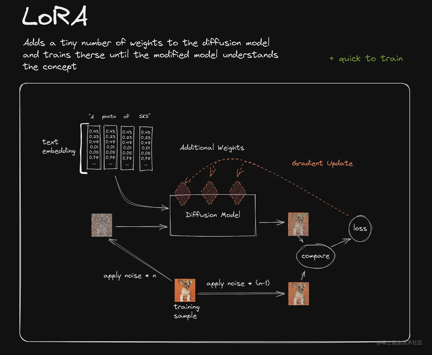LoRA 通过去噪训练过程在原有模型的基础之添加额外的中间层,并梯度更新这些中间层的参数权重,其大小通常文件在几十或者几百 MB左右,远远小于 DreamBooth 动辄几个G 的大小。