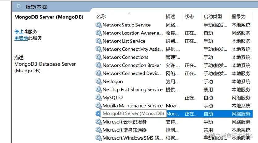 可以通过services.msc打开服务列表,找到mongodb的服务查看