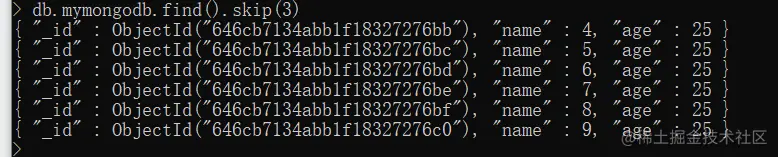 查询符合条件的跳过的记录:db.comment.find({条件}).skip(条数)