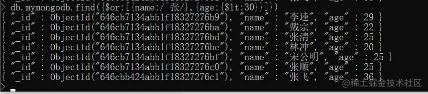 db.mymongodb.find({$or:[{name:/^张/},{age:{$lt:30}}]})