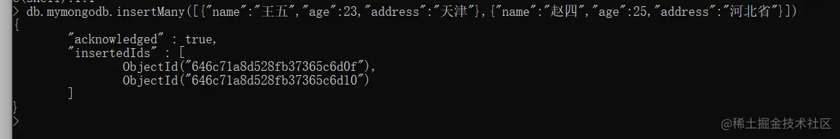 db.集合名.insertMany([{document1},{document2},{document3}...])