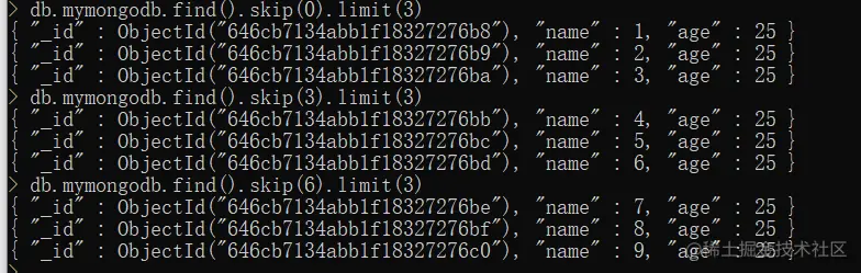 提示: skip(), limilt(), sort()三个放在一起执行的时候,执行的顺序是先 sort(), 然后是 skip() ,最后是显示的 limit() ,和命令编写顺序无关。