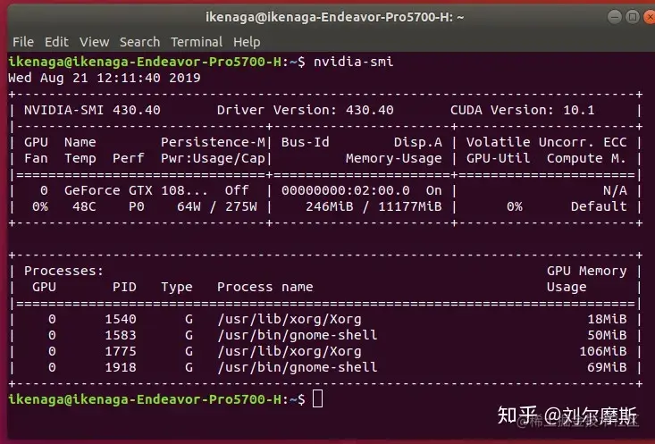 7.6. 重启之后分辨率恢复,打开终端,输入nvidia-smi检查一下。显卡驱动安装完成。同时cuda10.1安装完成。