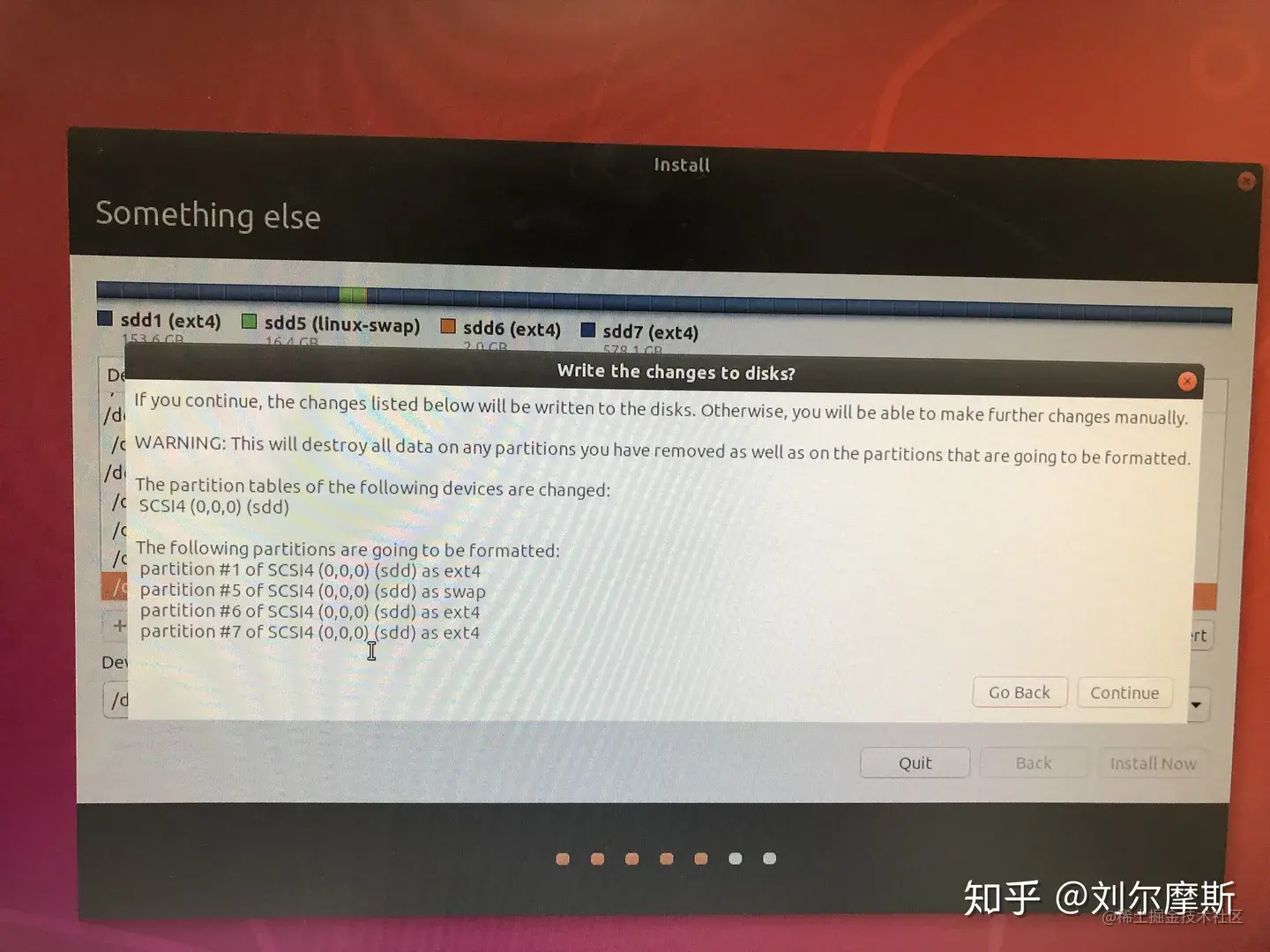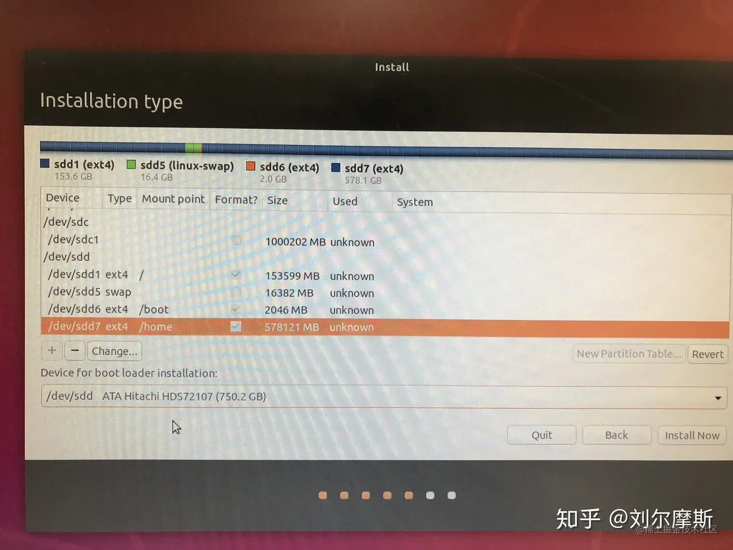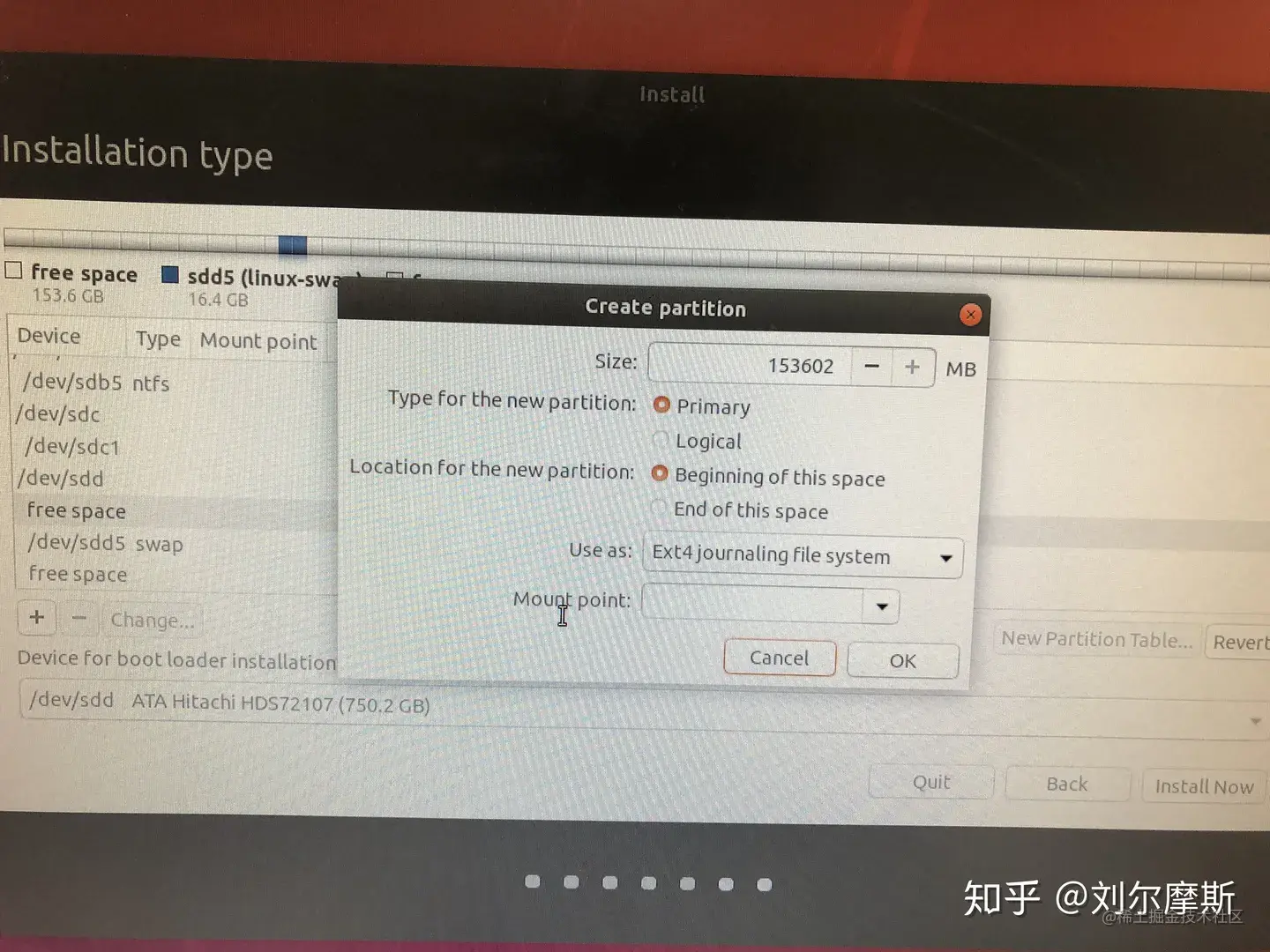 为了清楚自己每个磁盘的分布情况,一般是在自定义选项里自己规定ubuntu装在哪里。选自定义之后进入分区阶段。