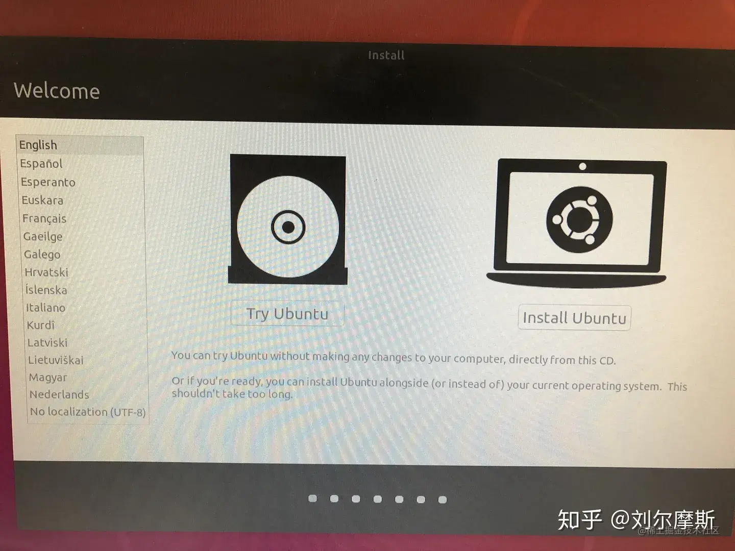 5.3. 进入ubuntu安装界面,选择安装ubuntu,语言建议大家选英语,因为做研究的小伙伴之后用到很多命令行,中文系统默认的一些文件名是中文的,文件名如果是中文的打起来很麻烦。在安装界面选择中文,安装之后切回英文也可以。