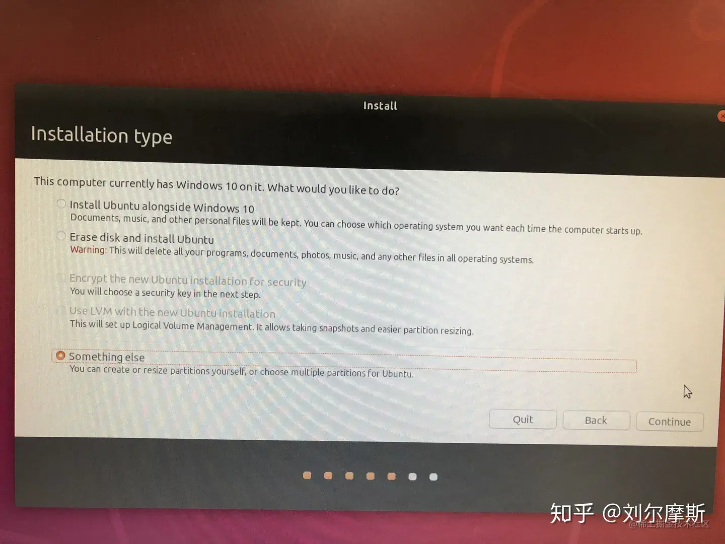 之后有操作系统的情况下,安装程序会检测出来并给你几个选项。共存,删除windows,自定义,这里第一个选项我没试过。如果对于ubuntu装在哪里无所谓,可以选择第一项,好处是不会出现问题,也不用设置启动项。