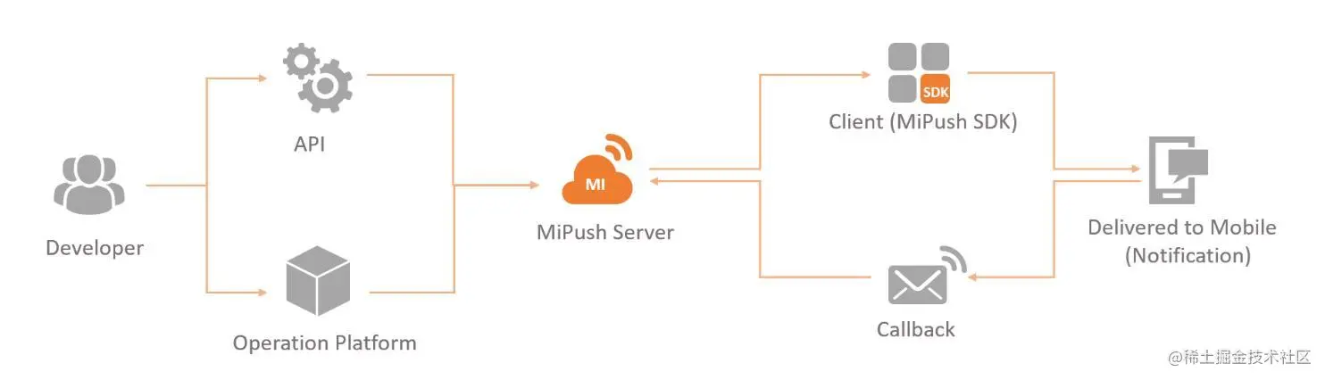 各厂商在push方案的实现上大体相同(厂商push接入流程,下图以MiPush为例),在使用厂商推送的过程中我们也遇到了很多问题,因此了解了各厂商的特性是制定出良好的触达策略前提。