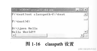 由上面的输出结果可以发现,虽然在D盘中并没有Hello.class文件,但是也可以用java Hello执行Hello.class文件,之所以会有这种结果,就是因为在操作中使用了set classpath命令将类的查找路径指向了f:\test目录,所有在运行时,会从f:\test目录查找所需要的类。