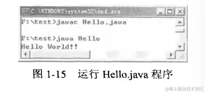 然后再D盘跟目录下执行java Hello命令,如图1-16所示。