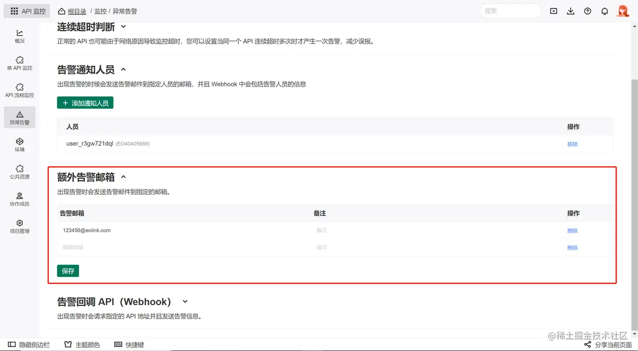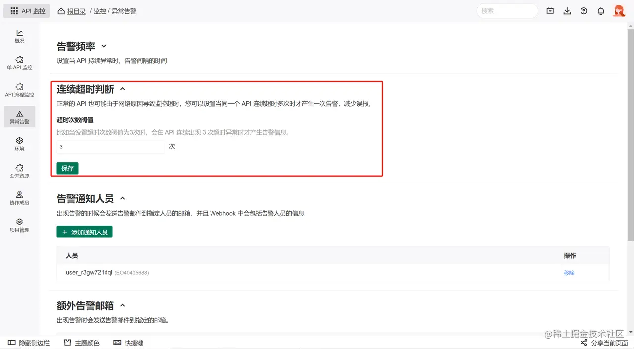 若成员没有在个人帐号内设置邮箱,或需要通知到项目外的人员时,可以直接在 额外告警邮箱 处设置告警邮箱: