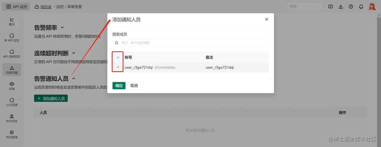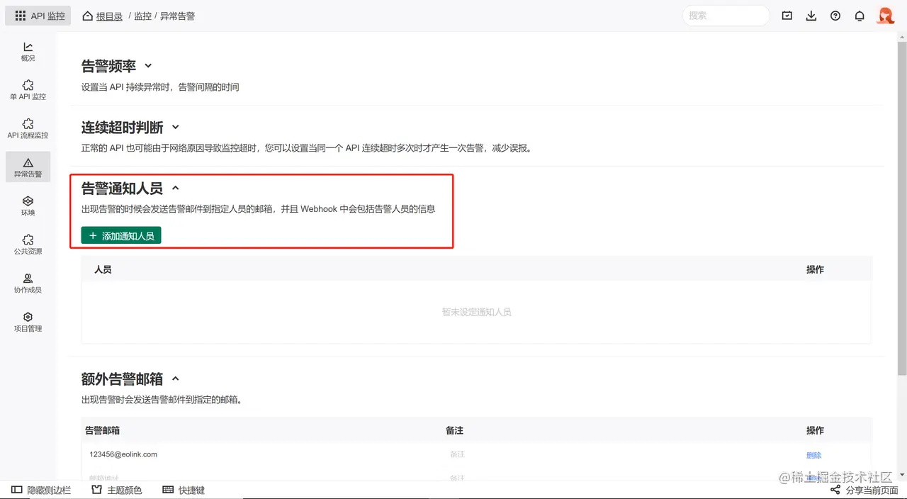 当 API 产生告警时,可以直接通知到具体的项目人员,点击 添加通知人员 :