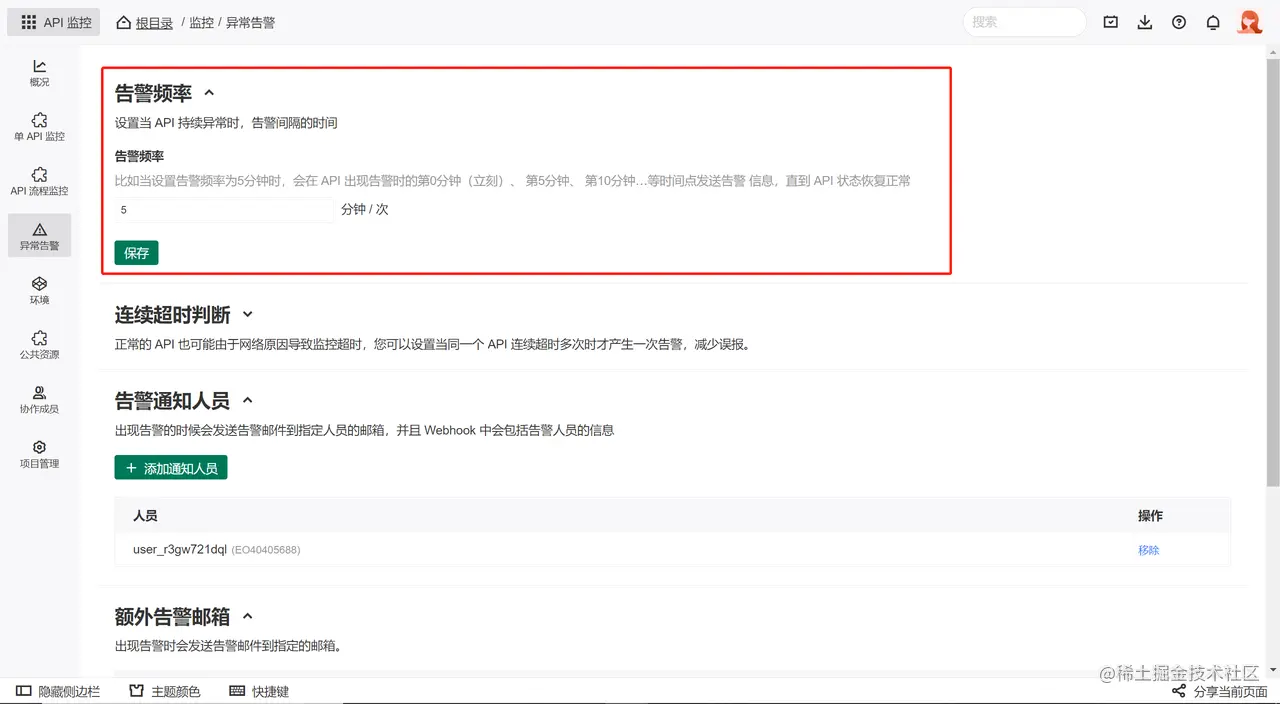 当 API 持续异常时,可以设置 API 的告警频率,比如当设置告警频率为5分钟时,会在 API 出现告警时的第0分钟(立刻)、 第5分钟、 第10分钟…等时间点发送告警 信息,直到 API 状态恢复正常。