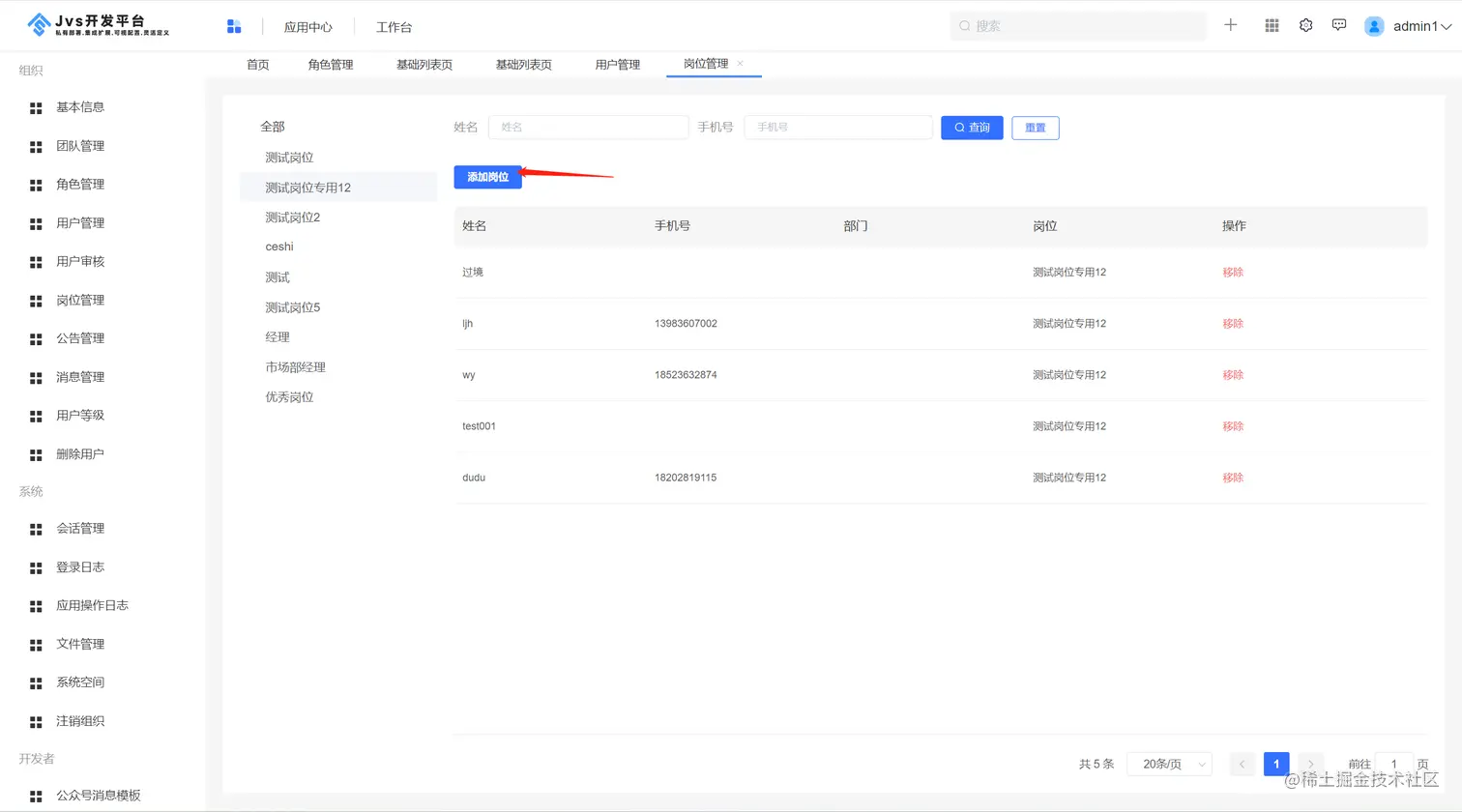 进入平台管理-岗位管理界面,如下图所示