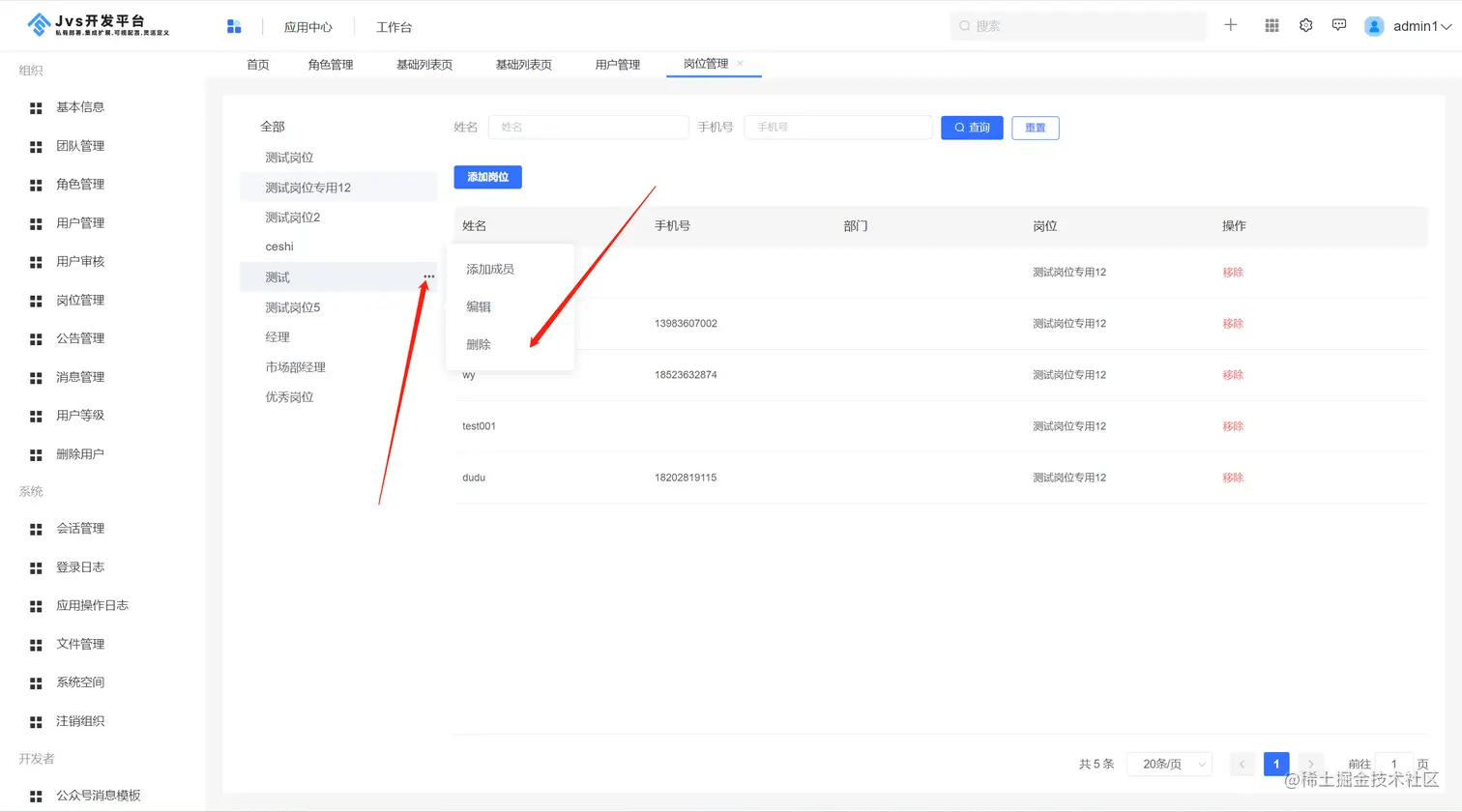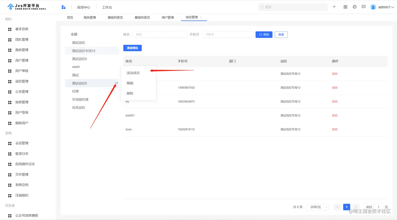点击岗位后的省略号,弹出岗位操作菜单,点击添加成员按钮,