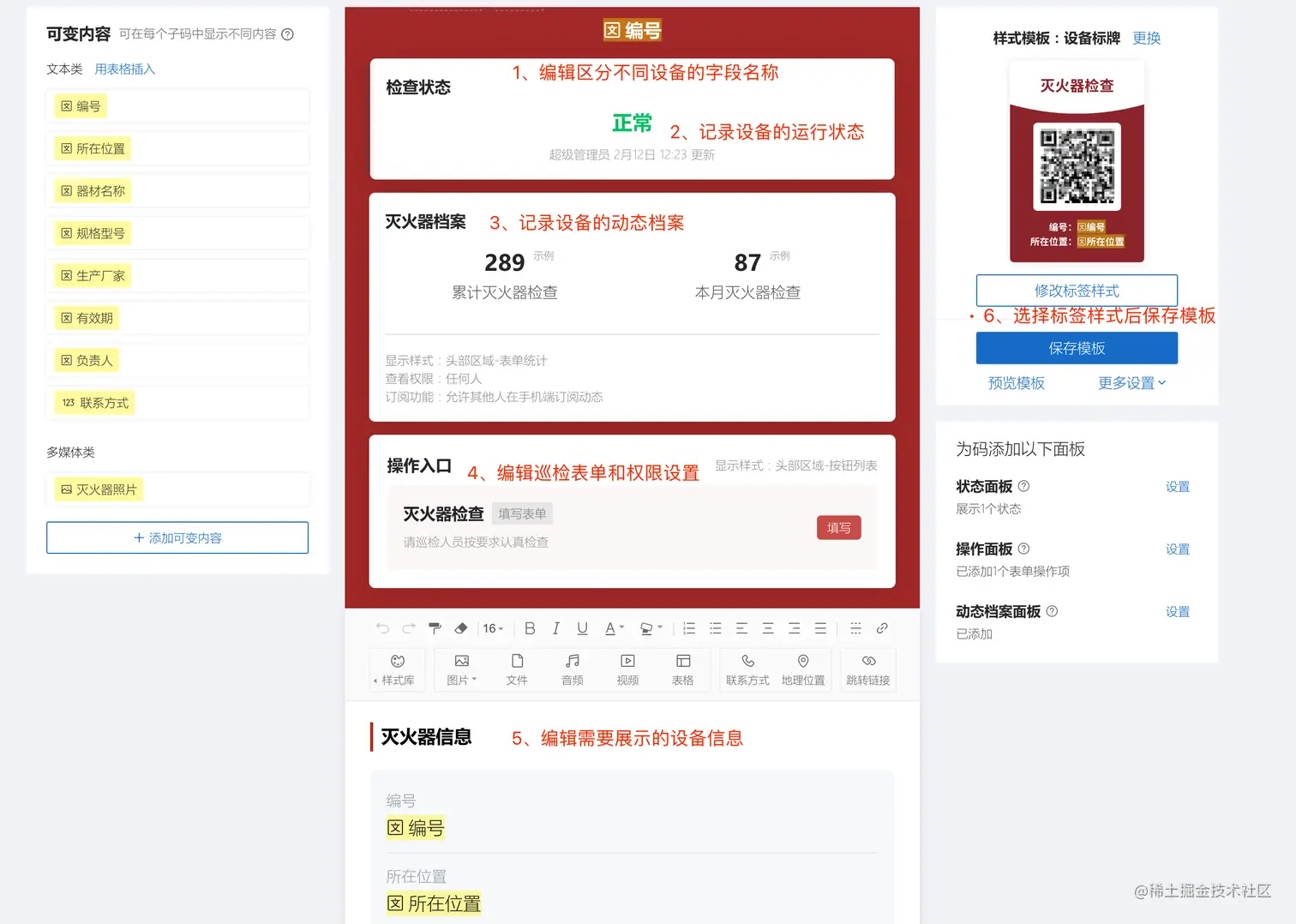根据实际的巡检需求在编辑器中修改模板中的信息,包括状态、动态档案、巡检表单、内容展示、操作面板等功能模块。模板修改后,还可以修改相应的标签样式,点击保存模板即可生成自己的模板。