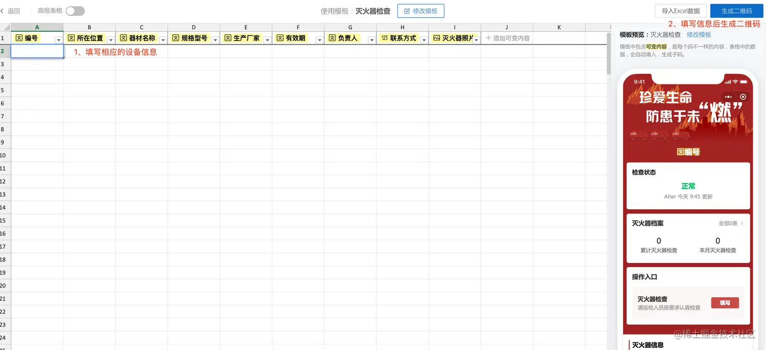 在模板库找到与自己需求最匹配的模板,比如灭火器检查。选择模板后,点击修改批量模板。(如果知识测试需求是否满足,可以选择单个生码或批量生码,在模板的基础上快速搭建系统进行体验。)
