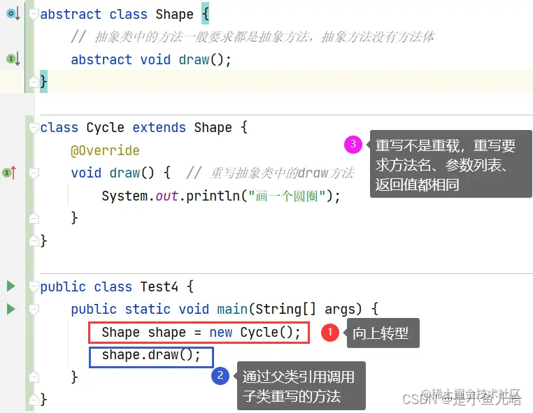 📝当我们的父类引用指向不同的子类对象时,当我们调用同一个draw方法时却输出了不同的结果。(其实就是该方法再子类中被重写成了不同形式)这就叫做多态 。