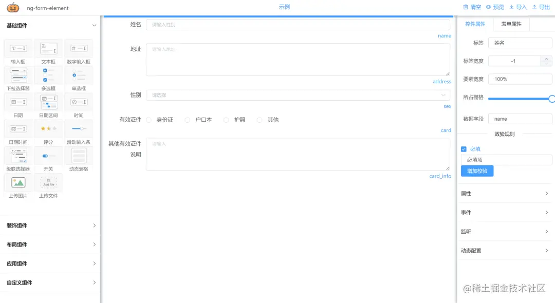 ng-form 是一个基于vue+element ui实现动态表单组件,通过拖拽组件到面板即可实现一个表单。支持各个组件的动态隐藏显示,动态表格弹窗式维护。