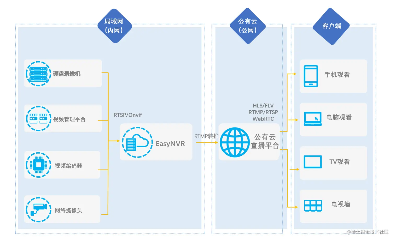 EasyNVR平台优秀的视频能力在于通过RTSP/ONVIF协议,将前端接入设备的音视频资源进行采集,并转码成适合全平台、全终端分发的视频流格式,包括RTMP、RTSP、FLV、HLS、WebRTC等格式。