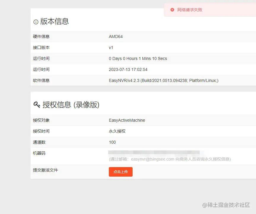 7)得出结论,在之前提示网络请求失败的版本查看web页面,显示永久授权实际并未授权,web页面显示存在问题,导致提示报错,告知用户之后重新让加密机授权,随后平台恢复了正常运行。