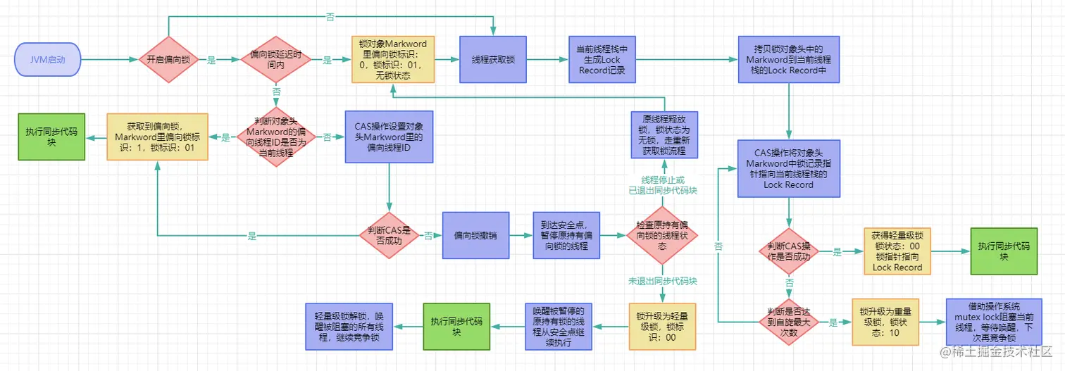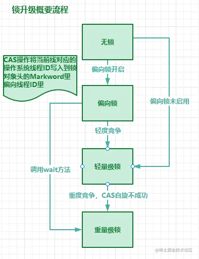 注意:图中无锁到偏向锁这不是升级,是在偏向锁打开后,对象默认是偏向状态,没有从无锁升级到偏向锁的过程。偏向锁未开启,会直接从无锁升级到轻量级锁,偏向锁开启时,会从偏向锁升级到轻量级锁。