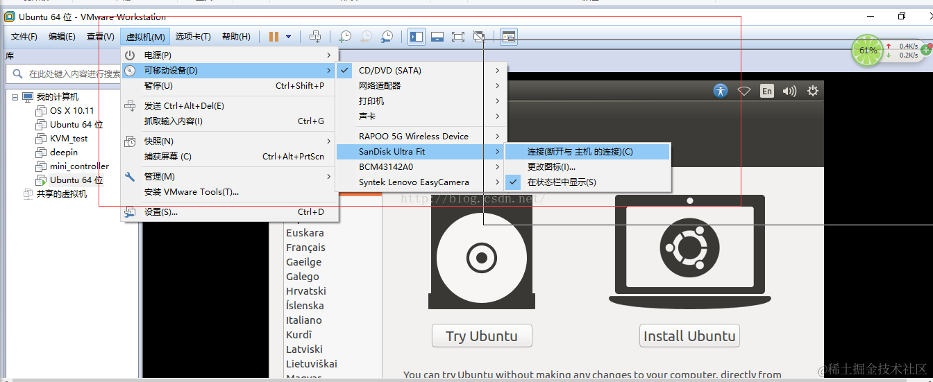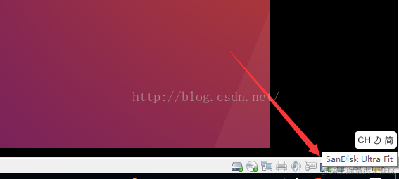 **如果还没有发现自己的U盘的话,启动虚拟机后,如下图将U盘链接上虚拟机。右下角出现了U盘的标识表明连接成功