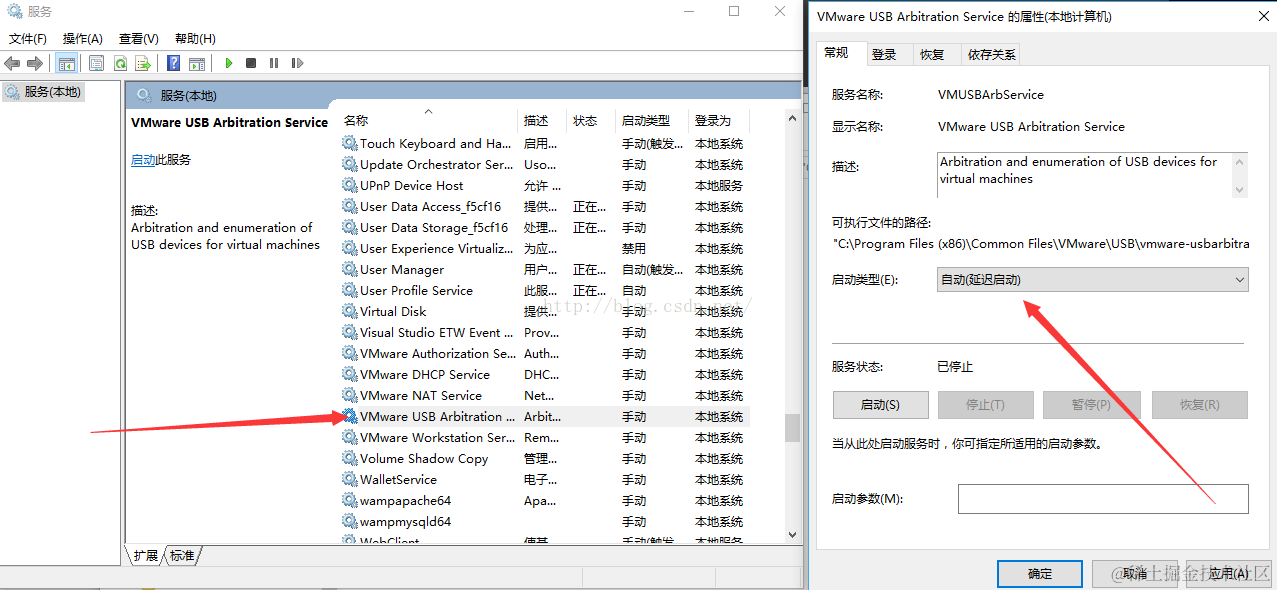 如果没有提示可移动设备,一般是VMware的usb服务没有启动。按住win+r 输入命令service.msc打开服务管理器,找到VMware USB Arbitrary然后右键启动,同时右键选择属性,把启动方式改成开始启动。
