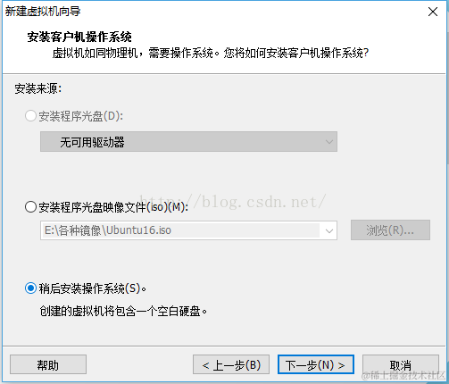 准备好环境之后我们需要在VMware里面新建一个虚拟机,注意选择安装来源的时候选稍后安装操作系统。其他的设置就用默认或者推荐就好。