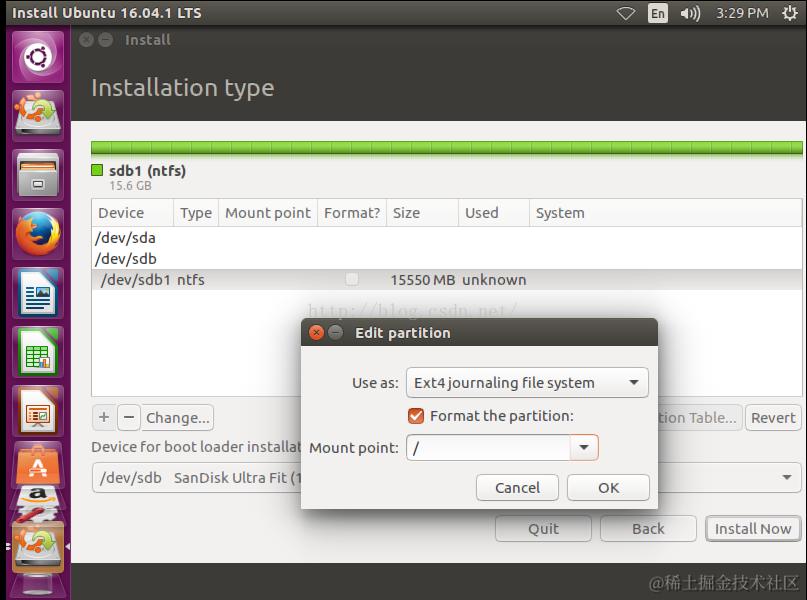 双击dev/sdb/ntfs 然后use as etx4,勾选上format格式化,然后mount point设置为 /