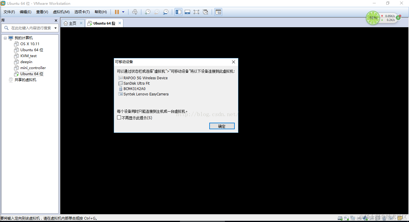 点击确定保存配置,插上事先准备好的U盘。然后点启动虚拟机。会弹出可选用移动设备的提示。如果没有请先看下一步。