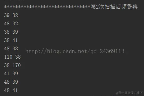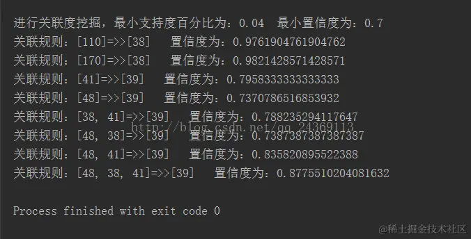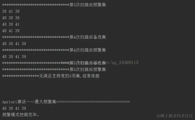 System.out.println("频繁模式挖掘完毕。\n\n\n\n\n进行关联度挖掘,最小支持度百分比为:"+MIN_SUPPROT+" 最小置信度为:"+MIN_CONFIDENCE);