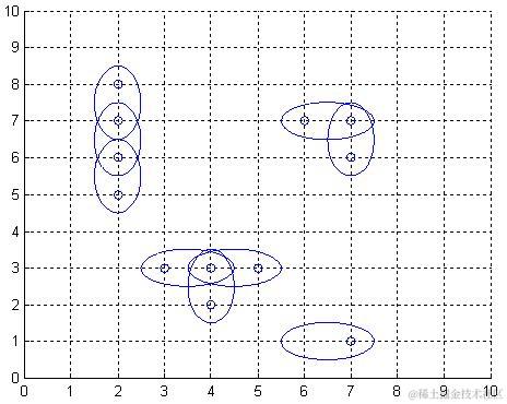 The Global Aerial Research Centre has been allotted the task of building the fifth generation of mobile phone nets in Sweden. The most striking reason why they got the job, is their discovery of a new, highly noise resistant, antenna. It is called 4DAir, and comes in four types. Each type can only transmit and receive signals in a direction aligned with a (slightly skewed) latitudinal and longitudinal grid, because of the interacting electromagnetic field of the earth. The four types correspond to antennas operating in the directions north, west, south, and east, respectively. Below is an example picture of places of interest, depicted by twelve small rings, and nine 4DAir antennas depicted by ellipses covering them.