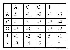 denotes that a space-space match is not allowed. The score of the alignment above is (-3)+5+5+(-2)+(-3)+5+(-3)+5=9.