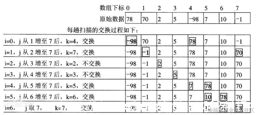 每一次从待排序的数据元素中选出最小(或最大)的一个元素,存放在序列的起始位置,然后,再从剩余未排序元素中继续寻找最小(大)元素,然后放到已排序序列的末尾。以此类推,直到全部待排序的数据元素排完。