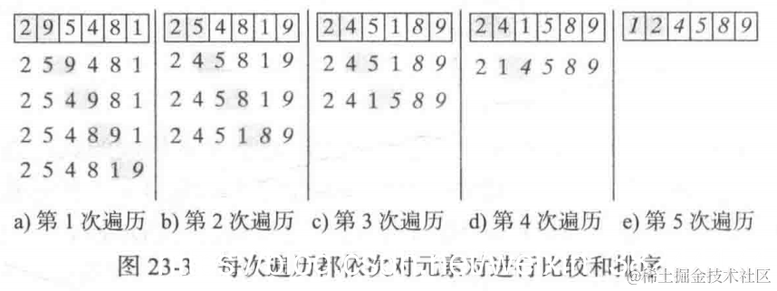 (4)持续每次对越来越少的元素重复上面的步骤,直到没有任何一对数字需要比较。