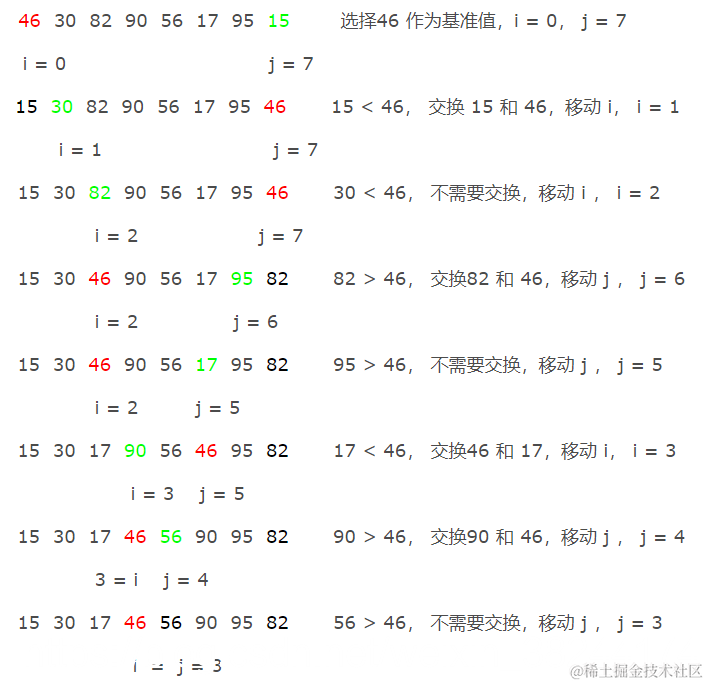 5)重复第3、4步,直到i=j;3,4步中,没找到符合条件的值,即3中A[j]不小于key,4中A[i]不大于key的时候改变j、i的值,使得j=j-1,i=i+1,直至找到为止。找到符合条件的值,进行交换的时候i, j指针位置不变。另外,i==j这一过程一定正好是i+或j-完成的时候,此时令循环结束)。值得注意的是,快速排序不是一种稳定的排序算法,也就是说,多个相同的值的相对位置也许会在算法结束时产生变动。时间复杂度为:O(n) =O(nlogn)
