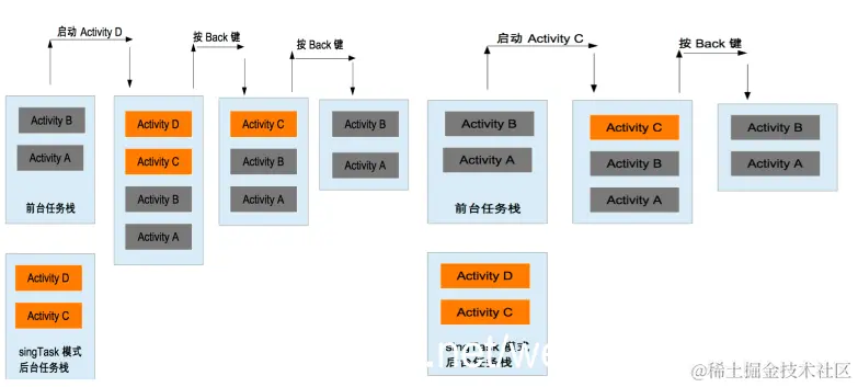 单实例模式,处理其他程序与我们程序共享这个活动的实例。这是一种加强的singleTask的模式,他除了具有singleTask的所有属性之外,还加强了一点,那就是具有此模式下的Activity只能单独的处于一个任务栈中,有些像Java中的static。eg:有两个任务栈,前台任务栈的情况为AB,而后台任务栈的情况是CD,这里假设CD的启动模式都是singleTask,现在请求启动D,那么整个后台任务站都会被切换到前台,这个时候整个后退列表变成了ABCD,当用户按back键的时候,列表中的Activity会一一出栈,如左图所示。