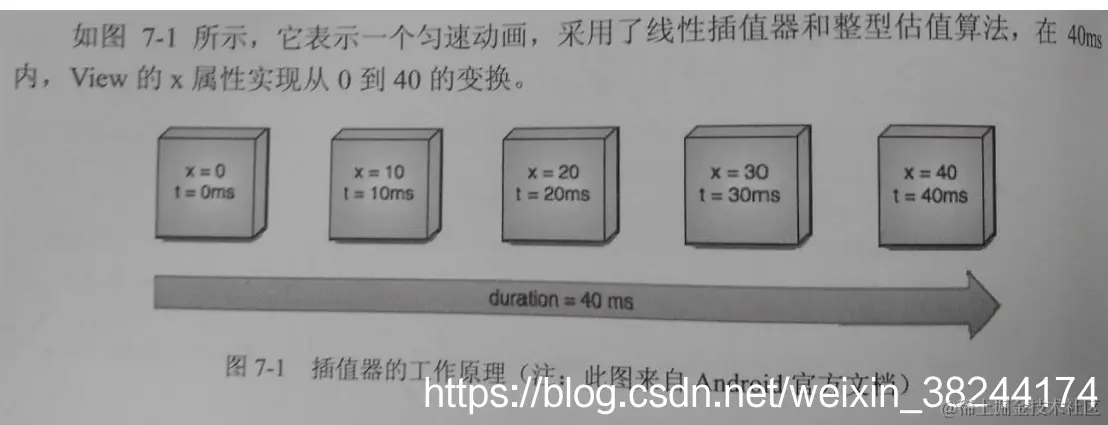 动画的默认刷新率为10ms/帧,所有该动画将分5帧进行,我们来考虑一下第三帧(x=20,t=20ms),当时间为20ms的时候,时间流逝百分比为20/40 = 0.5,那x改变了多少?插值器返回0.5,估值算法会根据0.5 0 40返回结果20。当然也可以自定义估值算法和插值器。