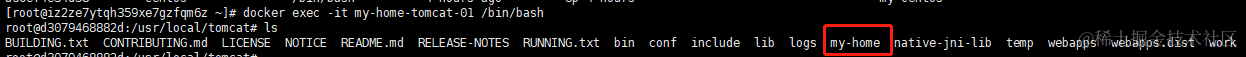 7.进入my-home-tomcat-01 container,并查看文件列表,发现是存在my-home目录的