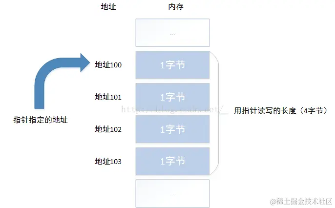 所以,使用指针变量c时能够从编号100地址中读写4字节的数据,如下图所示: