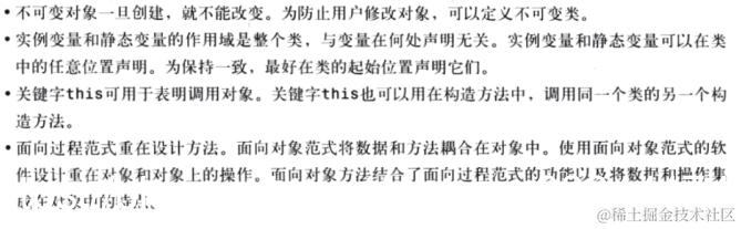 1.不可变对象和类:一旦创建,其内容就不能再更改。譬如:String类不可变;若一个类不可变,则其:(1)所有数据域必须是私有的(2)没有一个数据域提供公用的set方法(3)没有一个访问器方法,该方法会返回一个指向可变数据域的引用。