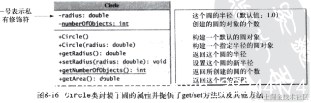 9.数据域封装:未封装可能会存在易被篡改、类难以维护的问题,因此我们使用private修饰符将数据域声明设置为私有的,使用get或set方法返回或获取数据域的值。示例项目如p228所示。其UML图如下所示:
