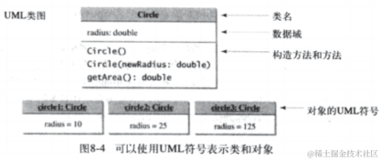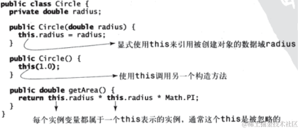 6.2.使用圆点运算符进行访问和调用,eg:使用myCircle.getArea()调用计算面积的方法。myCircle.radius引用对象的半径。getArea被称为实例方法、radius为实例对象。
