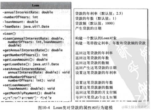 4.类的抽象和封装:类的使用者无需知道类是如何实现的,将实现的细节进行封装,对用户只显示使用方法,此称之为类的封装。我们以计算贷款偿还额的程序P279为例进行说明:很low,就是对类中的数据域使用private进行封装,然后使用set和get方法进行访问和调用。