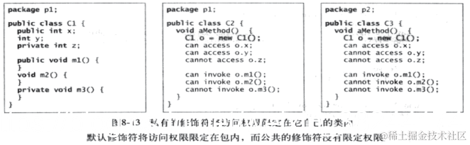 8.public、private和protected:private修饰符修饰的方法和数据与只能在自己的类中被访问,public默认修饰符只能在同一个包里面被访问,protected我们下一节再说。