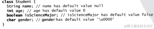 6.3.若引用类型数据域没有引用任何对象,则String等引用类型数据域的默认值为null;int类型的默认值为零;boolean类型的默认值为false;char类型的默认值为’\u0000’。