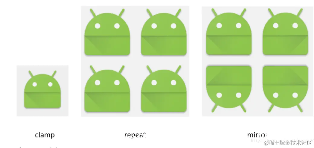 android:tileMode: 平铺模式,分为disabled | clamp | repeat | mirror 其中disabled 是关闭平铺模式,这个也是默认值,开启后,gravity属性会无效,先说下其余三个属性的区别,三种都表示平铺模式:1.repeat表示简单的水平和竖直方向上平铺效果;2.mirror表示一种在水平和竖直方向上的镜面投影效果;3.clamp表示四周像素扩散效果。