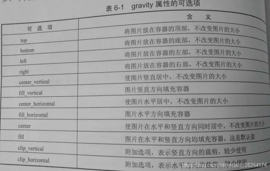 android:gravity: 图片小于容器尺寸,可对图片定位,位置方向,上下左右,可以用“|”符号来实现不同选项叠加。举例属性如下所示: