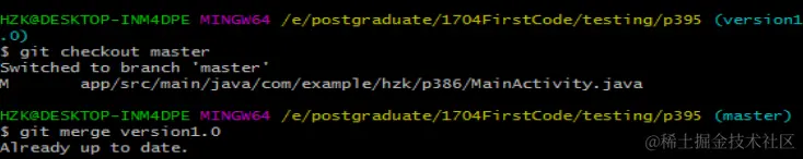 4.合并分支,首先切换分支到master,在合并version1.0的分支到master,也有代码冲突情况,需要静下心来去找。